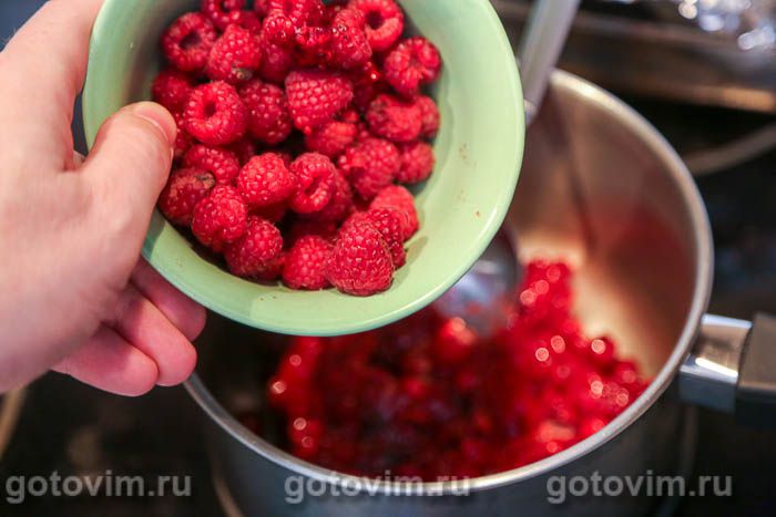 В кастрюлю переложить пюре из клюквы и малину целиком.