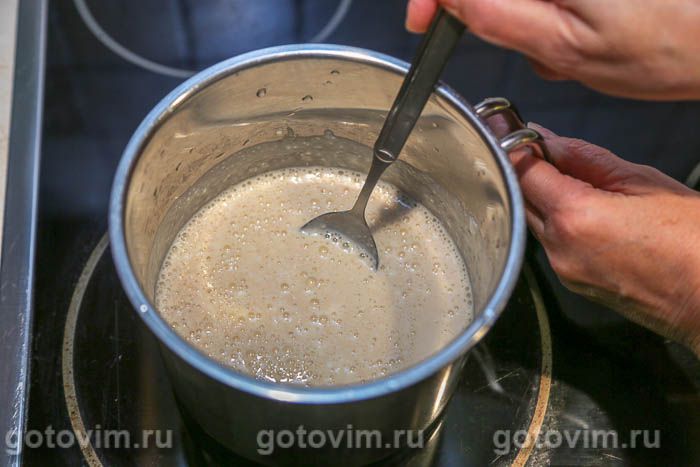 Перелить кефир в небольшую кастрюлю или ковш, поставить на огонь и хорошо прогреть. Снять с плиты, как только кефир начнет закипать.