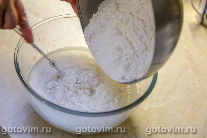 Тонкой струйкой влить кефир в яичную смесь, быстро помешивая.