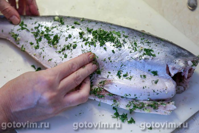 Натереть рыбу смесью лимонной цедры с рубленой зеленью укропа и чесноком, соли и перца.
