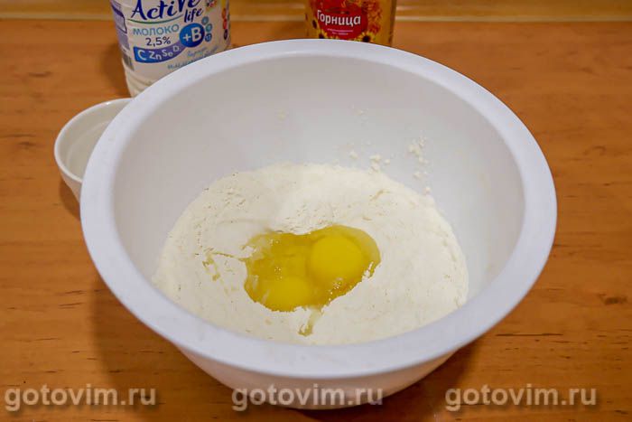 Добавляем 2 яйца и подливаем 210 мл молока.