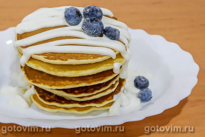Наливаем тесто на разогретую сковороду с антипригарным покрытием и жарим на среднем огне с двух сторон до готовности. Подавать панкейки можно со сгущённым молоком, мёдом, сметаной, вареньем или джемом. Приятного аппетита!