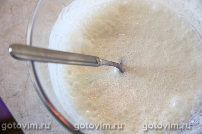 Приготовить тесто для панкейков. Для этого сметану перелить в миску, добавить соду и перемешать. Сода гасится, и на поверхности сметаны появятся пузырьки (как на фото). Важно соду хорошо перемешать, тогда в готовом тесте точно не будет неприятного содового привкуса.