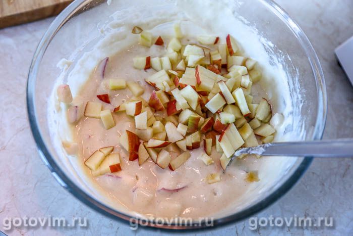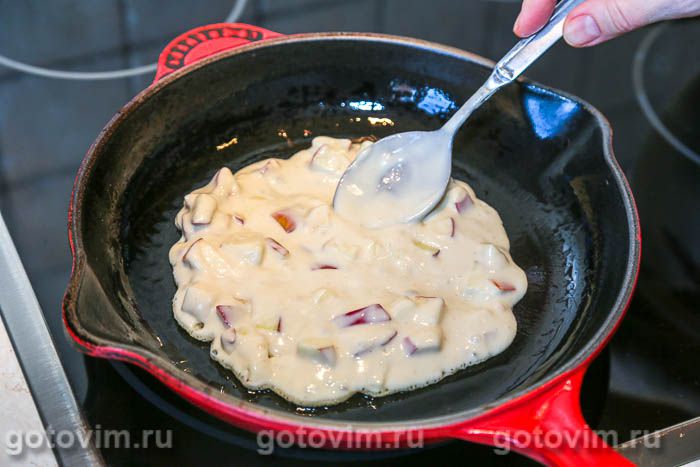 Примешать яблочные кусочки к довольно густому тесту для панкейков.