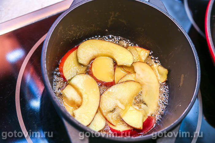 Когда панкейки будут готовы, приготовить для подачи яблоки в карамели. Для этого 1-2 яблока порезать тонкими ломтиками. В небольшом сотейнике разогреть кусочек сливочного масла, добавить яблоки и посыпать их сахаром. Прогреть яблоки в смеси сахара со сливочным маслом, пока они не станут мягкими, но не начнут разваливаться. Готовые карамелизированные яблочные дольки подавать вместе с панкейками. Приятного аппетита!