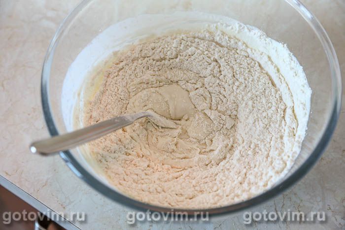 В другой миске соединить просеянную муку, обычный и ванильный сахар, соль и молотую корицу. Эту смесь примешать к сметане с содой.