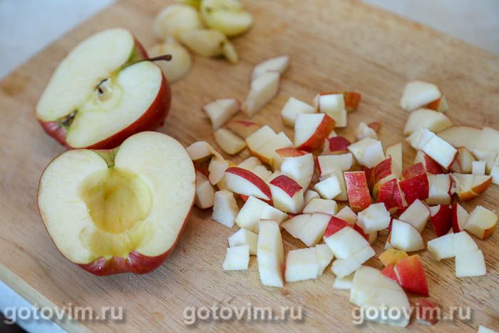 Яблоко вымыть, обтереть салфеткой, разрезать пополам и вырезать сердцевину. Затем порезать маленькими кубиками или тонкими пластинками.