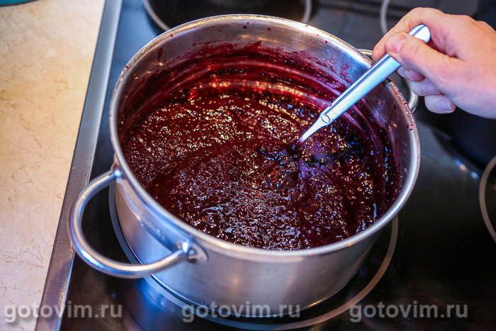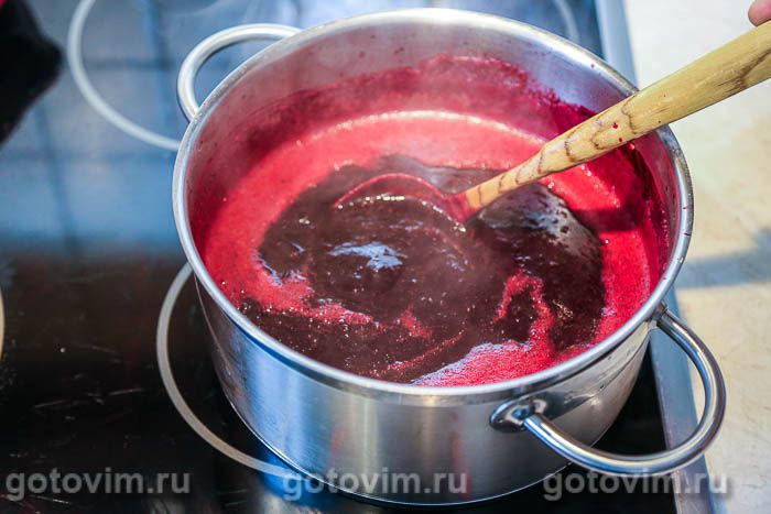 Черносмородиновое пюре протереть через металлическое сито (если вас не смущают мелкие косточки смородины в готовой пастиле, то эту процедуру можно пропустить). Добавить к пюре сахар, размешать и оставить примерно на 30 минут. После это поставить на слабый огонь, довести до кипения и варить, помешивая, около 10 минут.