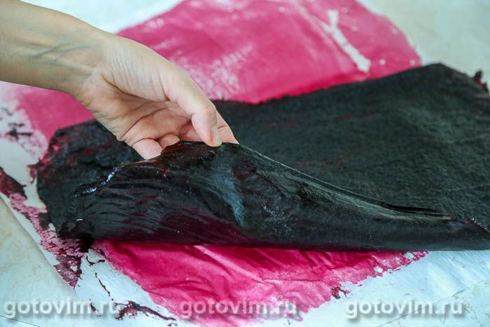 Противень (или любую другую подходящую поверхности) застелить пекарской бумагой и вылить ягодное пюре. Разровнять лопаткой, чтобы слой был не больше 2-3 мм.