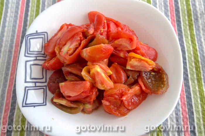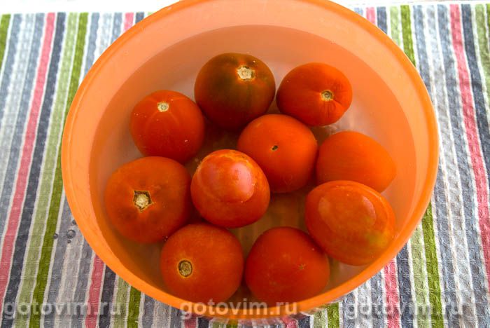 Подготавливаем спетые помидоры: выкладываем их в глубокую миску и заливаем овощи крутым кипятком. Через несколько минут сливаем воду и заливаем помидоры ледяной водой.