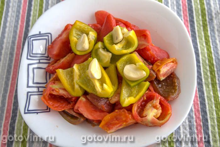 Очищаем чеснок от сухой шелухи. Насыпаем к помидорам, перцу и чесноку необходимую норму соли.