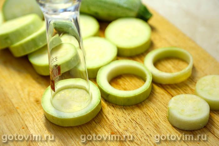 Молодые кабачки вымыть, обтереть досуха и разрезать на шайбочки толщиной коло 2 см. Из каждой шайбочки вырубкой для печенья или рюмкой вырезать серединку. У нас получатся колечки шириной по краям примерно 1 см. Обвалять эти колечки в муке с солью.