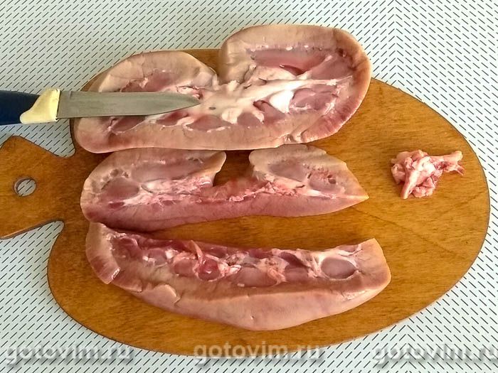 Вымоченные почки становятся светлыми. Разрезать их на четвертинки, удалить жир.