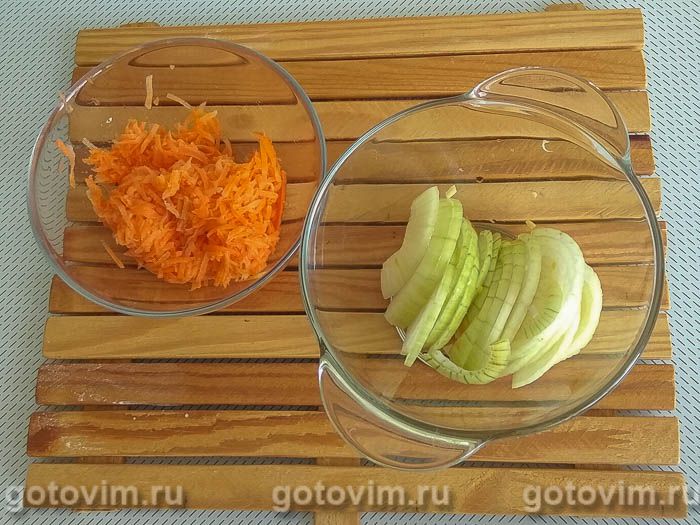 Пока варятся почки почистить морковь и репчатый лук. Лук порезать, морковь измельчить на терке.