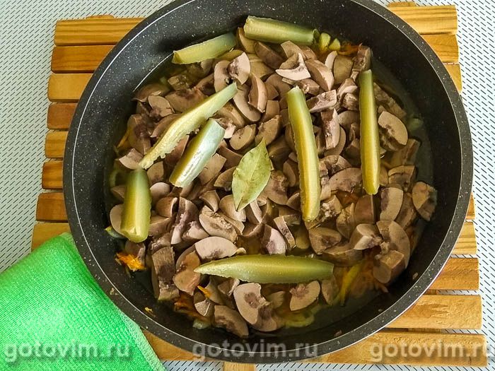 Половину говяжьего бульона вылить в сковороду к пассеровке, добавить порезанные почки, один лавровый лист, разрезанные на четвертинки солёные огурцы и тушить 10 минут под крышкой.