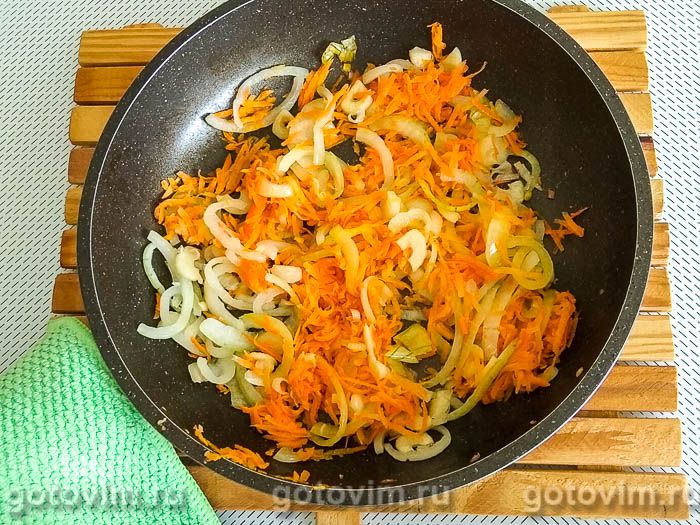 Лук обжарить на растительном масле до прозрачности. Добавить к нему морковь и тоже пожарить.