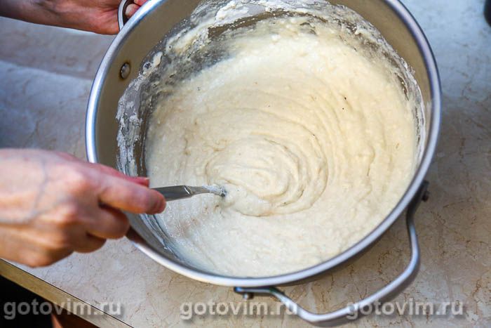 Манку залить третью от общего объема молока. Оставить на 15 минут. Добавить соль и сахар, хорошо перемешать.