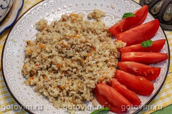 Готовый рис перемешать с мясным фаршем и с овощами и можно подавать на стол. Приятного аппетита!