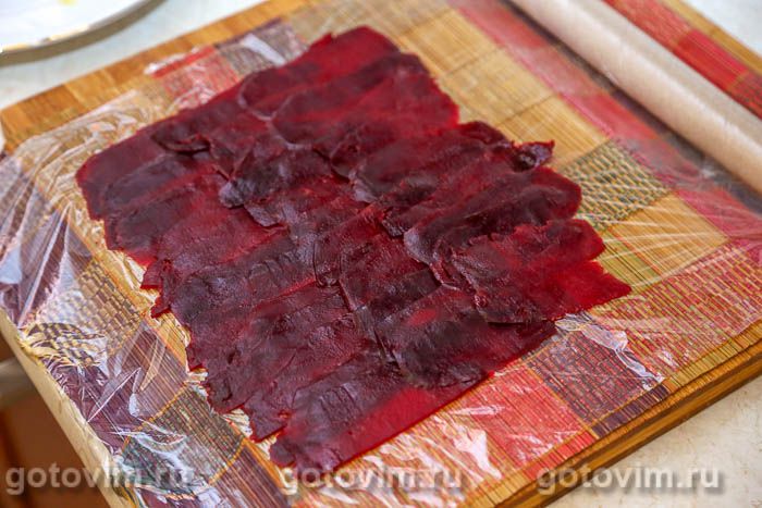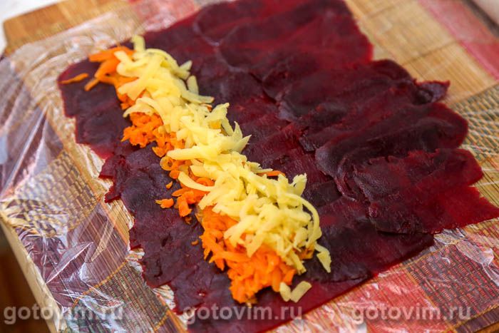 Коврик для скручивания суши застелить пищевой пленкой. Вместо специального коврика можно взять салфетку из соломки. Выложить на пищевую плёнку внахлёст тонкие ломтики свеклы в форме прямоугольника.