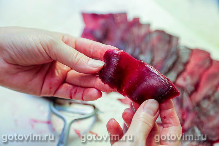 С варёных овощей слить воду, полностью остудить, а затем очистить. С помощью овощечистки нарезать вареную свеклу тонкими полосками.