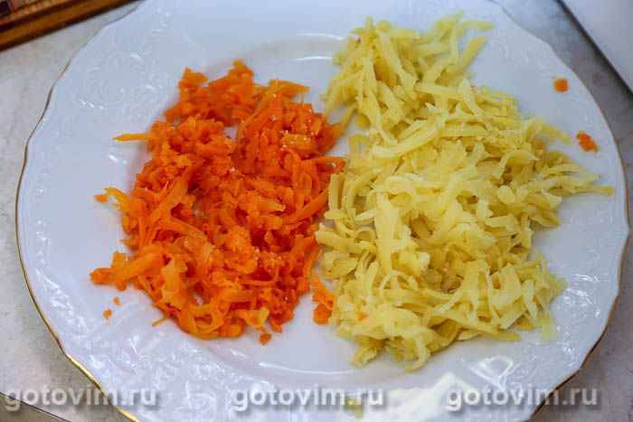 Морковь и картофель натереть на крупной терке. То же самое проделать с яйцом, если готовите роллы с ним.