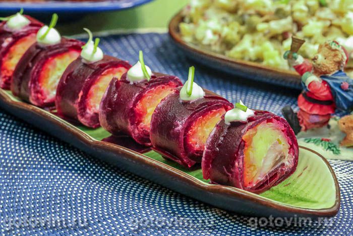 И снова готовим селедку под шубой. На этот раз подаем любимый салат в виде роллов. Думаете это сложно? Нет, просто, вкусно и удобно. Особенно, если готовите для большой компании – считай, уже готовые порции на тарелке. Селёдка под шубой в виде роллов готовится без нори. И без яиц: яйца убрала из рецепта, потому что они окрашиваются свекольным соком и роллы выглядят не очень. Но если вас это не пугает, то смело кладите в закуску яйца. По вкусу эти роллы похожи на классическую «Селёдку под шубой».