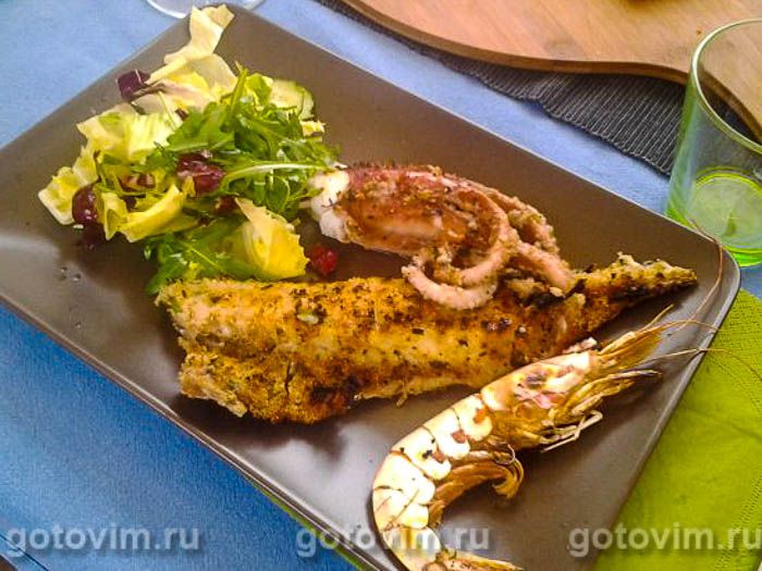Первая партия готова, вторая в принципе тоже — креветки и остальные осьминоги. Как только угли готовы, поместили решетку с рыбой. Рыбка на гриле готовится очень быстро и такая двойная решетка не позволит ей ‘развалиться’ при переворачивании. Когда первая партия будет готова, можно будет поместить на решетку креветок и остаток осьминогов. Салат ко всей этой красоте придется очень кстати.