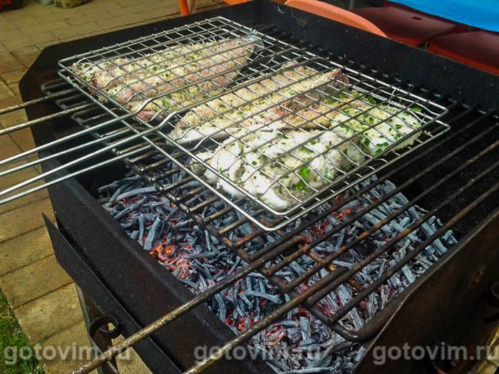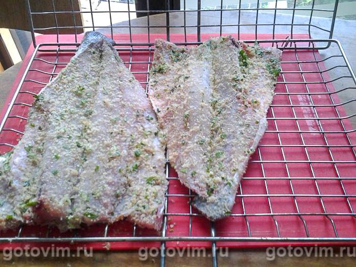 Теперь взяла вот такую решетку для гриля. Обваляла рыбку в ароматизированной хлебной крошке и разместила на решетке.