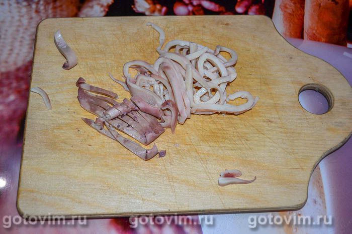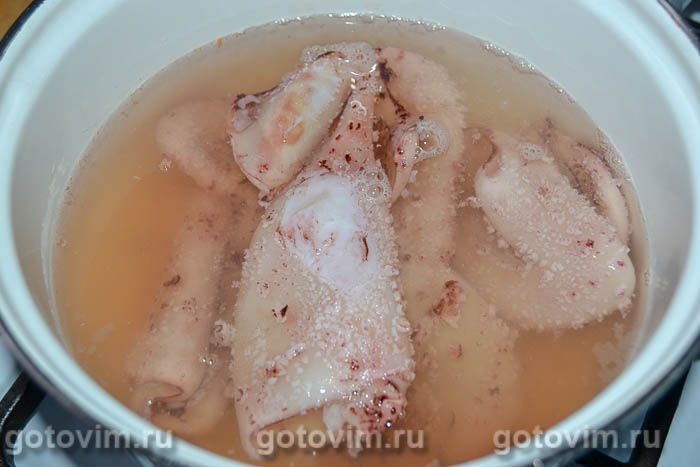 Варить морепродукт 2-3 минуты. Затем, остудить и почистить кальмары.