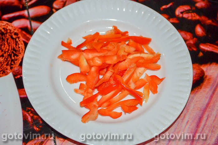 Сладкий перец разрезать пополам, удалить семена и порезать соломкой.