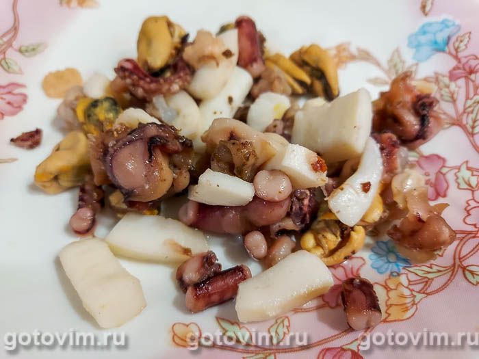 В первую очередь подготовить для салата морской коктейль. Для этого его надо отправить в кипящую подсоленную воду и варить около 3 минут. Затем откинуть на дуршлаг и переложить морепродукты в холодную воду на пару секунд. Эта процедура нужна для того, чтобы остановить приготовление морского коктейля. Поэтому морской коктейль получится нужной нам консистенции.