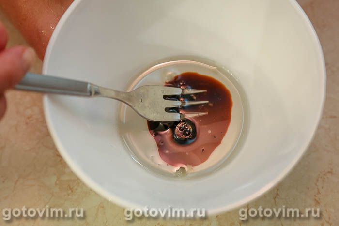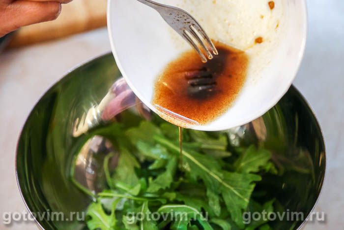 Приготовить салатную заправку, смешав в миске вилкой растительное масло по своему вкусу с бальзамическим уксусом и пропущенным через пресс зубчик чеснока.