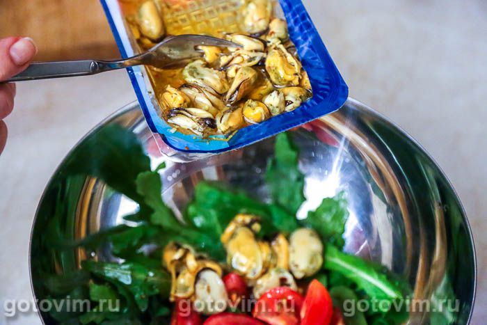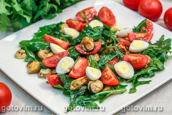 Салат из мидий с помидорами черри и рукколой. Рецепт с фото