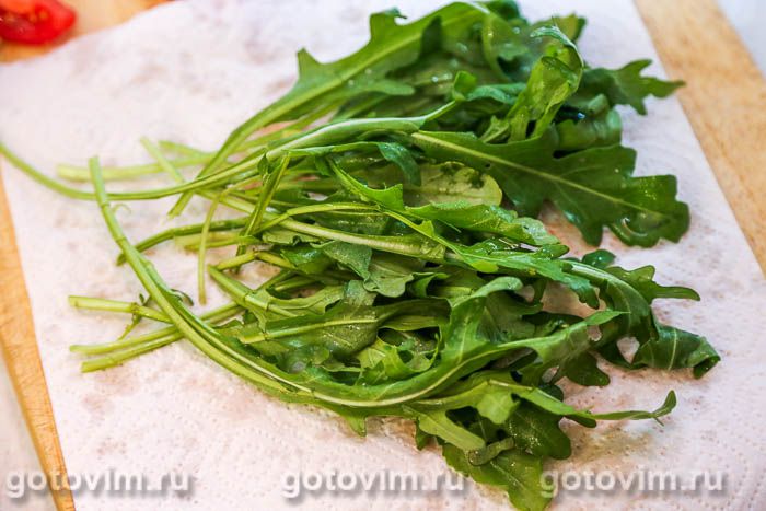 Рукколу вымыть, обсушить на бумажных полотенцах.