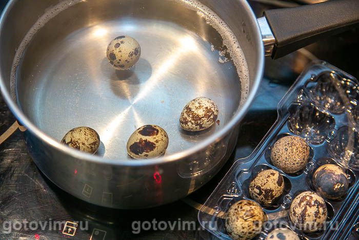 В отдельной кастрюле сварить перепелиные яйца. Положить их в холодную воду и когда вода закипит варить 5 минут. В отдельную посуду налить холодную воду. Скорлупу каждого вареного яйца слегка надбить и переложить яйца в холодную воду. Так легче будет их очищать.