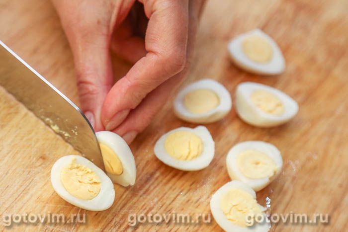 Вареные яйца очистить и порезать половинками или четвертинками.