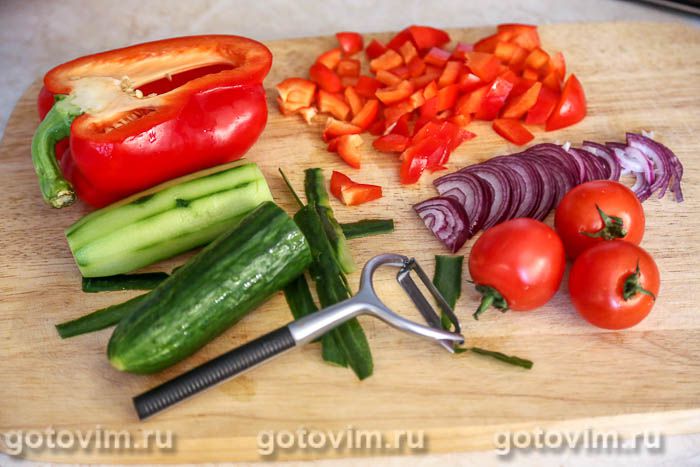 Подготовить овощи для салата. Помидоры, огурцы и сладкий перец вымыть и обтереть салфеткой. Огурцы порезать кубиками. Помидоры нарезать дольками, удалить семена и сок, а оставшуюся часть нарезать кубиками. Лук порезать тонкими полукольцами, а сладкий перец — соломкой или кубиками.