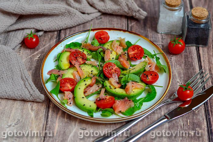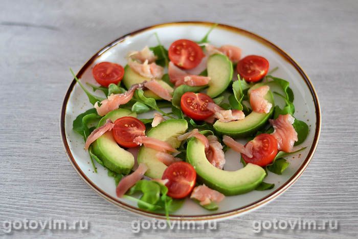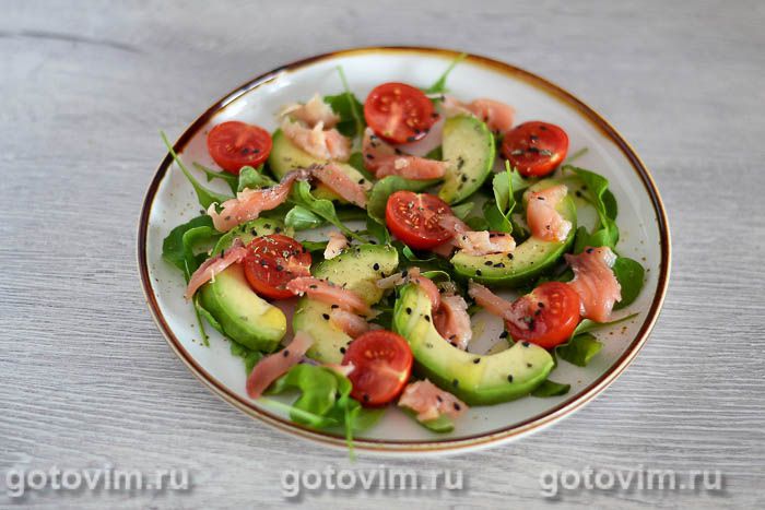 Салат со слабосолёной горбушей, авокадо и помидорами черри. Рецепт с фото