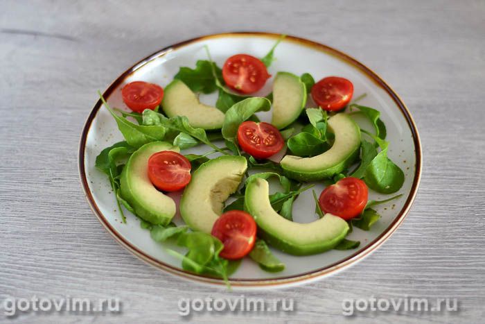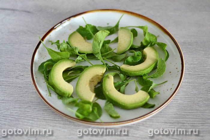 Авокадо очищаем от кожицы, разрезаем вдоль пополам и нарезаем на тонкие ломтики. Выкладываем на подушку из рукколы в произвольном порядке.