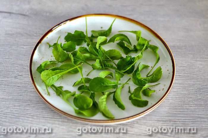 Рукколу ополаскиваем водой, промакаем бумажными полотенцами и раскладываем по порционным тарелкам.