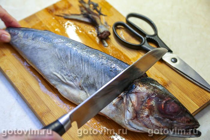Сардину вымыть под холодной водой, отрезать голову и плавники, вскрыть брюшко и осторожно удалить внутренности. Обсушить бумажным полотенцем, удаляя черную пленку от внутренностей. Слегка присыпать соль снаружи и внутри.