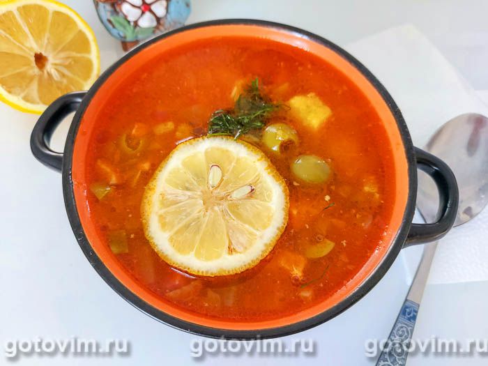На этом приготовление солянки из свинины подошло к концу. Теперь осталось разлить её по тарелкам, добавить в каждую порцию дольку лимона и украсить маслинами. Приятного аппетита!