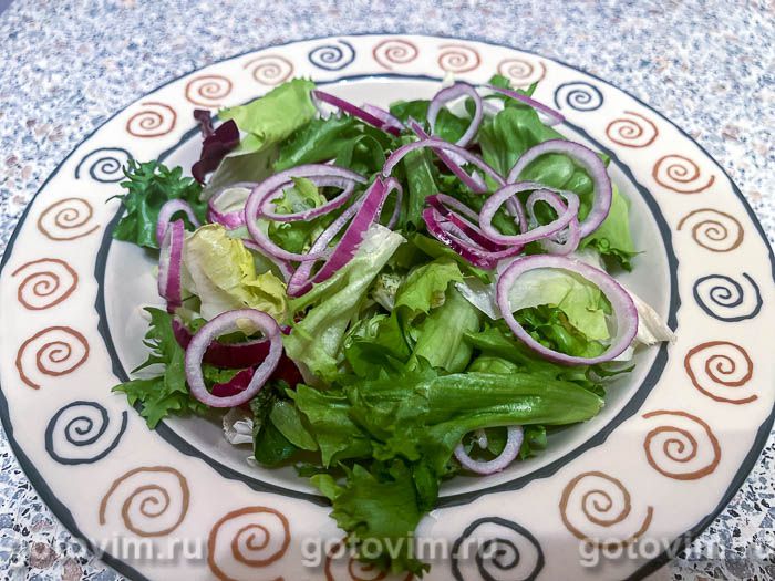 На дно плоского сервировочного блюда уложить салатный микс. Луковицу порезать кольцами и разложить поверх зелени.