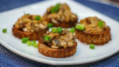 Тартинки из ржаного хлеба с телячьими мозгами и грибным соусом. Рецепт с фото