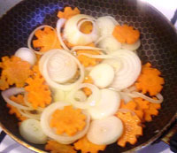 Две моркови и две луковички порезать колечками. Обжарить морковь и лук с двумя ложками растительного масла. Остывший картофель порезать произвольно крупными кусочками и выложить в кастрюльку с толстым дном. Сверху уложить обжаренные лук и морковь.