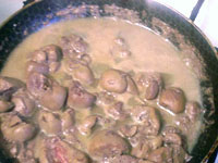 Почки выложить в сухую сковороду и тушить под крышкой 10 минут. Затем слить жидкость которая получилась в процессе тушения почек, а сами почки ещё раз хорошо промыть. Выложить в кастрюльку с овощами, добавить 1 банку зеленого горошка вместе с жидкостью.