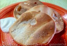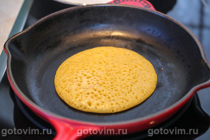 Разогреть хорошо блинную сковороду с антипригарным покрытием. В этом случае маслом сковороду не смазывать. Если опасаетесь, что блин бесповоротно к ней прилипнет, слегка смажьте дно сковороды растительным маслом. Наливать на сковороду примерно 3 ст.л. теста, разровнять края панкейка и ждать, пока на поверхности теста начнут появляться дырочки, как на фото. Когда появятся дырочки, а тесто заметно подсохнет и затянется, перевернуть лопаточкой панкейк на другую сторону и печь до готовности.