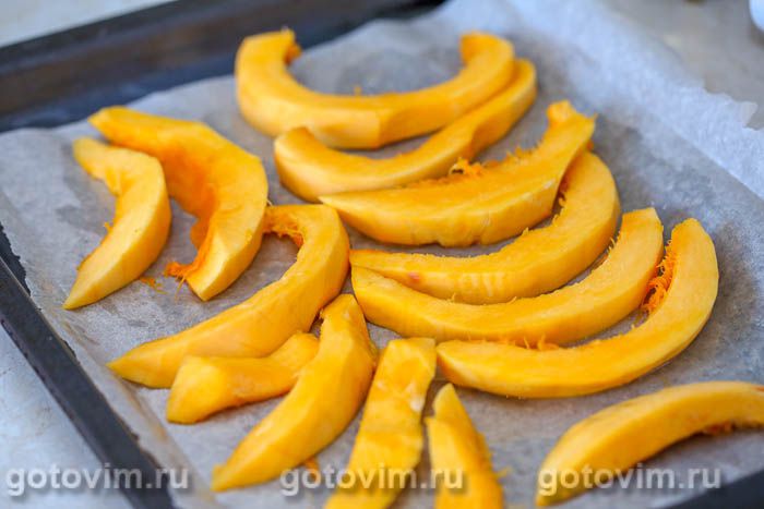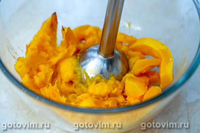 Приготовить тыквенное пюре. Для этого сочную, сладкую тыкву очистить от семян и кожуры, мякоть порезать на дольки толщиной 1-1.5 см и запечь до мягкости в прогретой до 200С духовке.