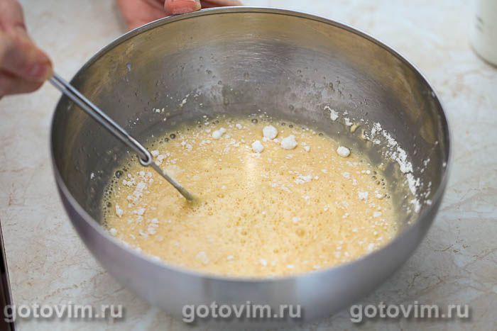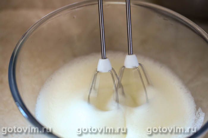 В отдельной миске взбить белки с сахаром в устойчивую пену. Переложить взбитые белки в миску с тестом и аккуратно перемешать, чтобы они не успели осесть.