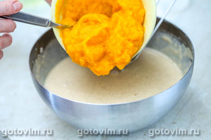 Добавить в тесто растительное масло, оставшееся молоко и тыквенное пюре.
